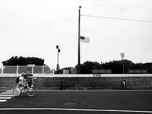American Beach Cruiser captures a fleeting moment along a quiet seaside road: a lone rider glides by on a beach cruiser bicycle on a lazy summer day. Shot in high-contrast black and white, the image feels both timeless and immediate. At the center, an American flag hangs at half-mast, anchoring the scene with a quiet gravity. It’s a portrait of motion and stillness, youth and reflection, set against the open breath of the coast.
