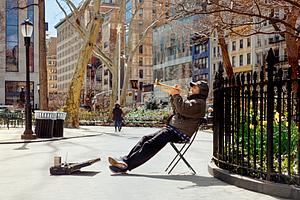 A trumpet player busks in Madison Square Park on a cold but sunny spring day in New York City. Captured on Kodak film with a 1960s-era Konica rangefinder camera, the image evokes a sense of peace and stillness amid the cityโ€™s constant motion and noise.